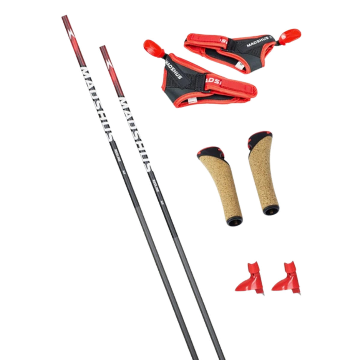 töngin er úr 100% kolefnatrefjum, sem þýðir að stafirnir eru sterkbyggðir og gera þér kleift að skíða hraðar og á skilvirkari hátt. Stafirnir koma með mótuðum handföngum úr korki sem falla vel í lófa og eru með gott grip og stillanlegar ólar (Madshus Race Strap 2.0)