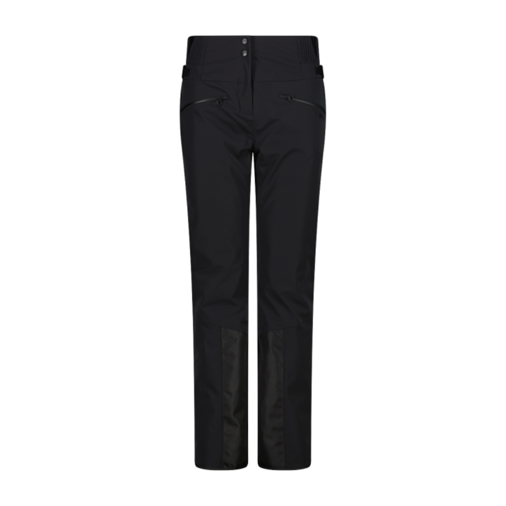 Dömuskíðabuxur frá ítalska merkinu CMP. Buxurnar eru úr fjögurra átta teygjanlegu twill efni. Buxurnar eru háar í mittið og mittisbandið er úr teygjuefni og heldur vel við mittið. Niðurlímdir saumar, vatnsheldir vasar, Clima Protect himna og vatnsheld meðferð á efninu gera skíðabuxurnar veðurheldar og öndunargóðar í öllum veðurskilyrðum.