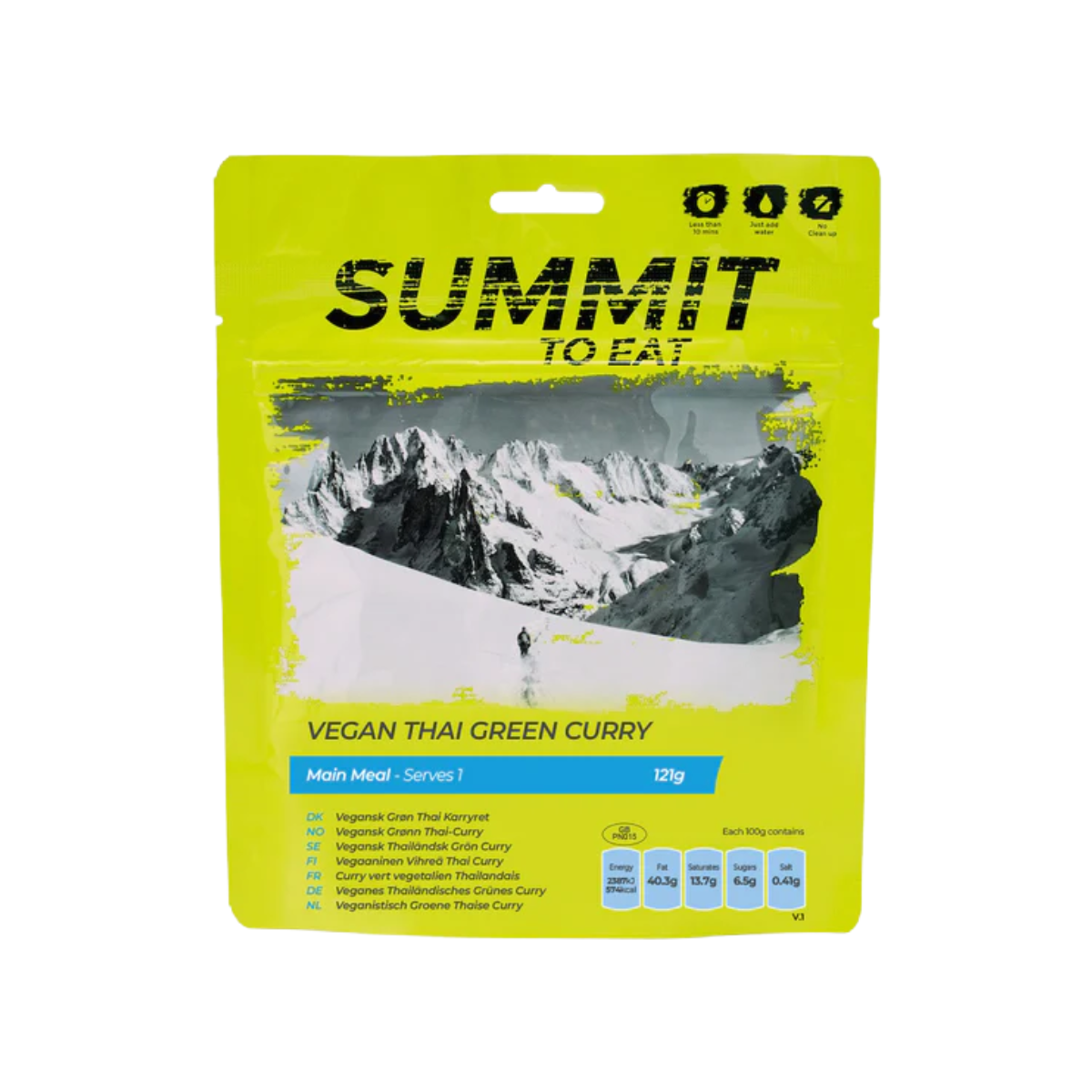 Vegan Thai Green Curry máltíðin frá Summit to Eat er fullkomin í öll ævintýri. Í þessum rétti færð þú ríkulegt bragð af kókosmjólk, tælenskum kryddum og braðgóðu grænu karrý, sítrónugrasi og ferskum kóríander.